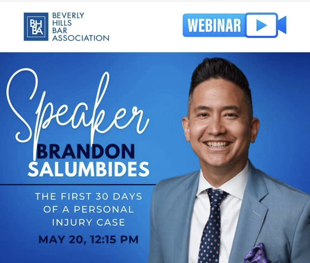 On May 20, catch Brandon Salumbides as he shares his knowledge with the Beverly Hills Bar Association! Brandon will be speaking on the webinar “The First 30 Days of a Personal Injury Case”. Brandon will detail what to do during the first 30 days of a personal injury case. This educational event is a do-not-miss