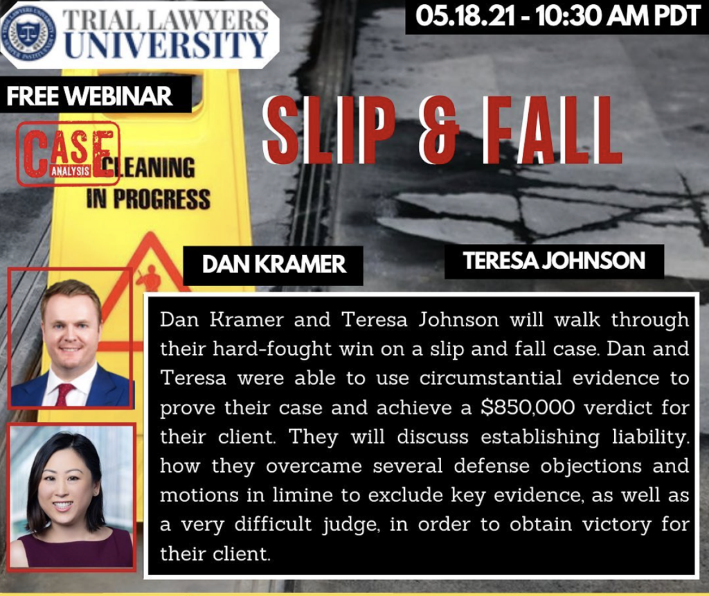 Join us tomorrow morning at 10:30am PDT featuring Teresa Johnson and Dan Kramer for a Case Analysis webinar. During this webinar, we will deep dive into a hard-fought win on a slip and fall case where Teresa and Dan were able to use circumstantial evidence to prove the case and achieve a $850K verdict!